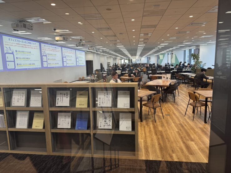 上層階フロアは社員の方の事務スペースになっていますが、色々なタイプのテーブルがあり、それぞれ自分が気に入りの場所で(自由席!)オンライン会議をされていたり、チームミーティングをされたりしていました。